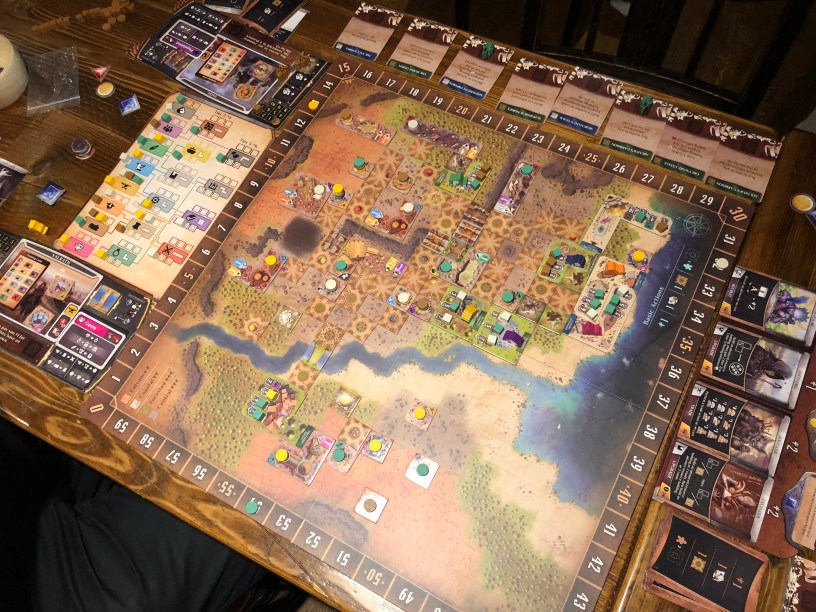 So there’s action selection with cards, lead/follow and there’s a complicated points system. That’s a lot to think about and why the rules teach can be a challenge. Add to that the small asymmetries between each faction and the importance of blocking connections that your opponents are trying to make (especially through walls and rivers) – it’s a really tough game for beginners.