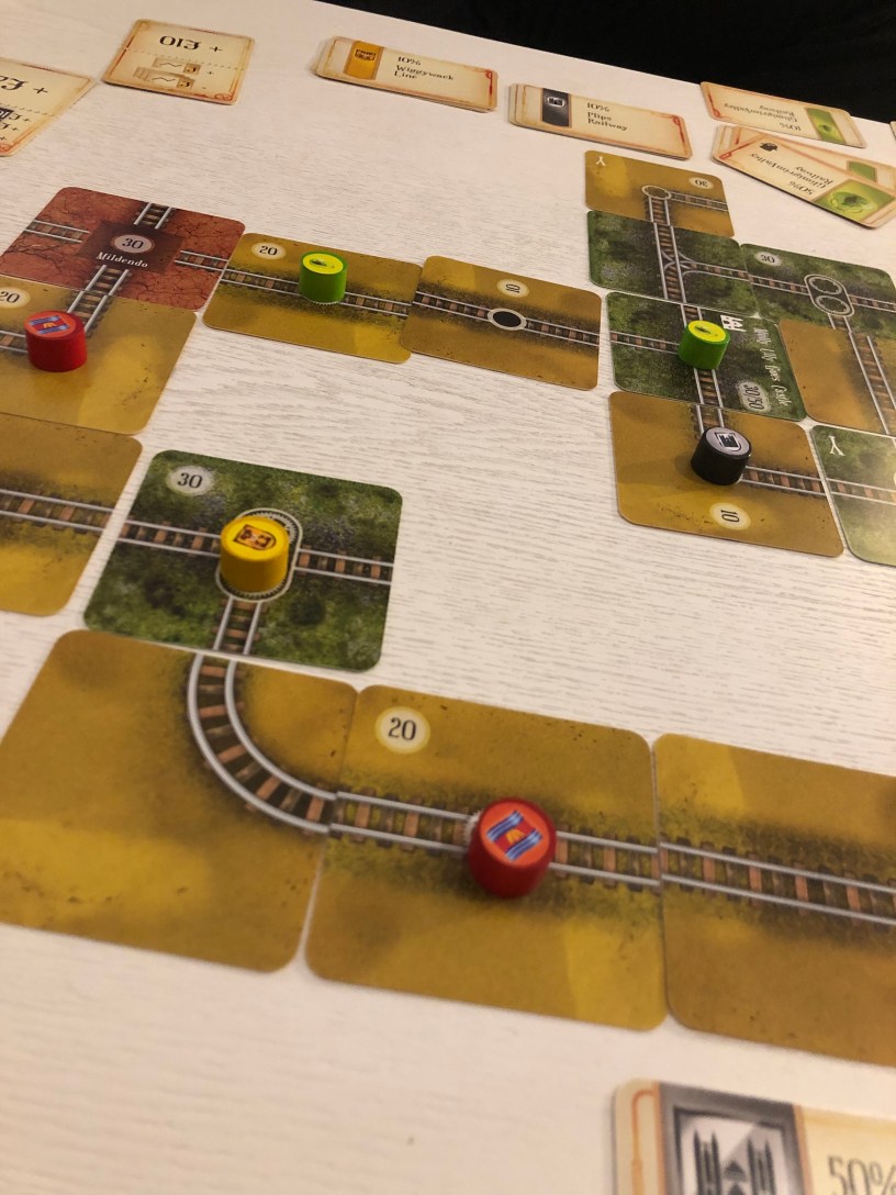 Coming back to the map then…this is a really interesting 18xx because the map can vary, and there are rules to the placement which make it possible for players to block off other players. There are limited pieces just like other 18xx games – and again this can allow players to block each other.