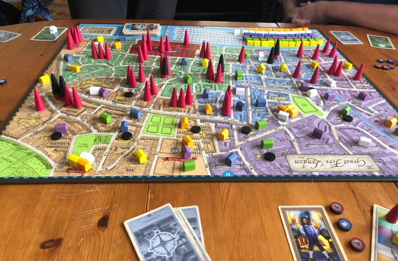 This leads to meeples chasing firemen across the board, fire being pulled from areas to reduce the number of firemen needed and meeples chasing each other around so as not to hand anyone points. Imagine a sort of Benny Hill sketch where they all chase each other around, but set in the fire of London. That’s sort of how it feels.